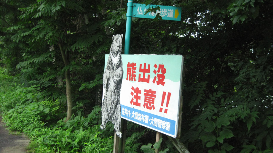 仏ヶ浦に着いたのはいいが…その入口には、「熊出没注意(くましゅつぼつちゅうい)!!」の看板が“どーん”と立っている。ここまできて…「虻の次は熊かよ…」と思い、海岸に聳え立つ岩「仏ヶ浦」方面へと下る。途中、仏ヶ浦に向かおうとしていた家族と出会ったが、彼らはお年寄りや子どもを連れていたので、下にある仏ヶ浦までは行かなかった。すぐに駐車場へと引き返して、「頑張ってくださいね」とぼくに一声かけて帰って行った。