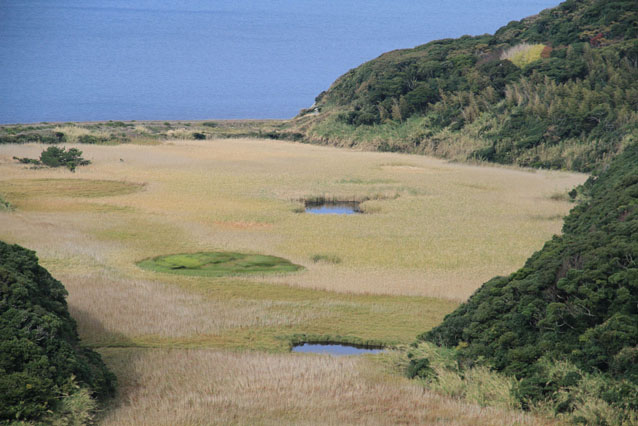 広大で静かな雰囲気の湿原地帯があった。伊島の穴場だ…。今は12月。ぼくら以外に観光客はいない。そもそも伊島に観光客は来るのだろうか。島内の自然で、おそらくここが一番綺麗だろう。ここには、戦前に米作が行われ水田があったところ。稀少昆虫(きしょうこんちゅう)や野鳥が確認されているとのことから、環境省の「日本の重要湿地500」に選定されたそうだ。