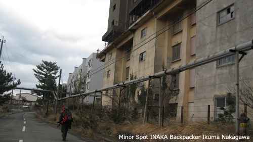 長崎県 池島 空っぽのアパートが建ち並ぶ先を歩く… 建物の前のパイプは一体なんなんだ? |