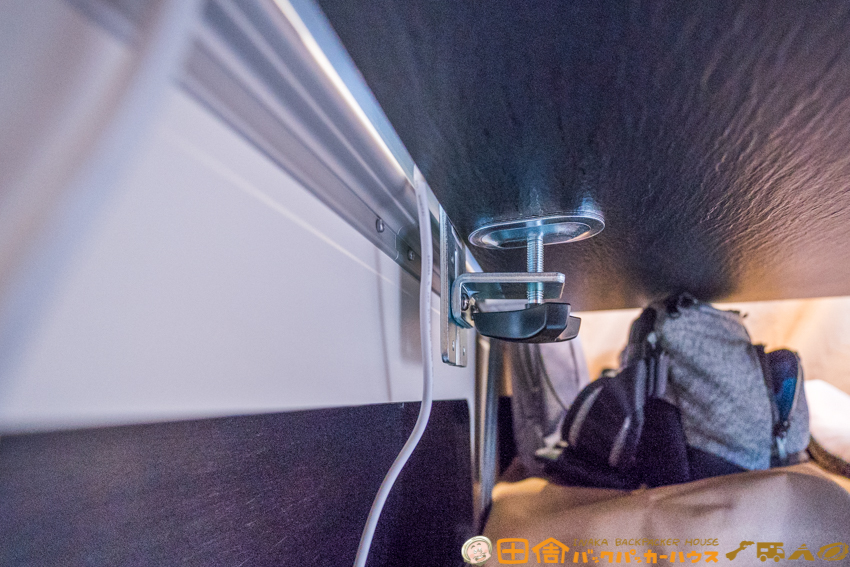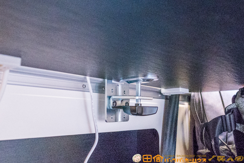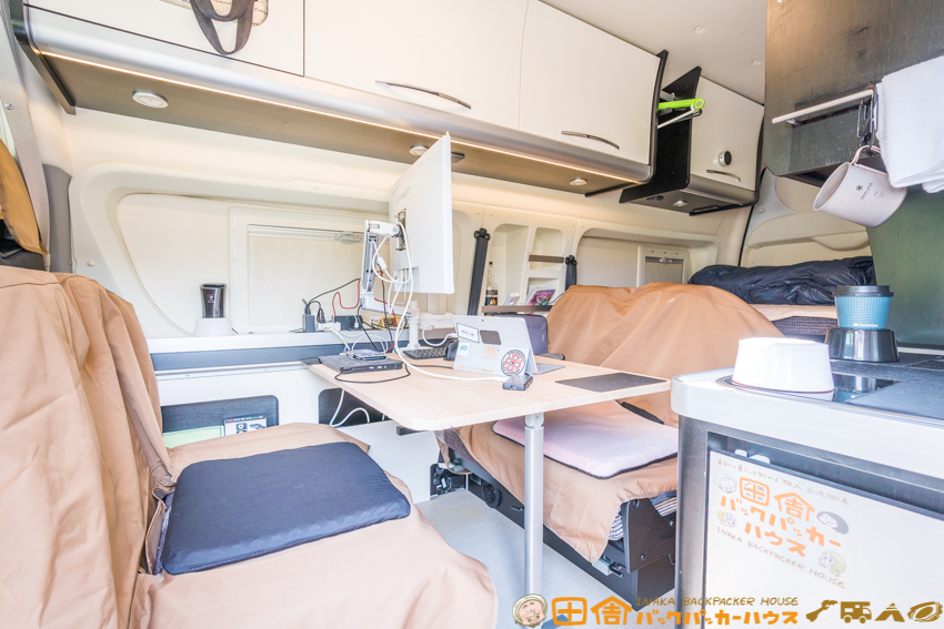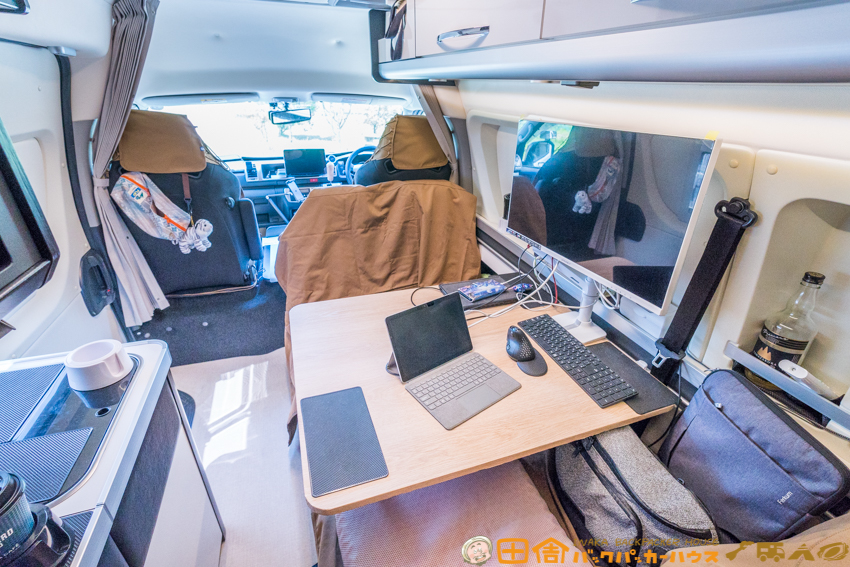 テーブルは純正のものから、より大きいサイズのものに交換。キャンピングカーの仕事用デスクとして広い天板はマストアイテム。仕事用のデスクは、可能な限り大きいサイズを使用することが、ぼくのこだわり。