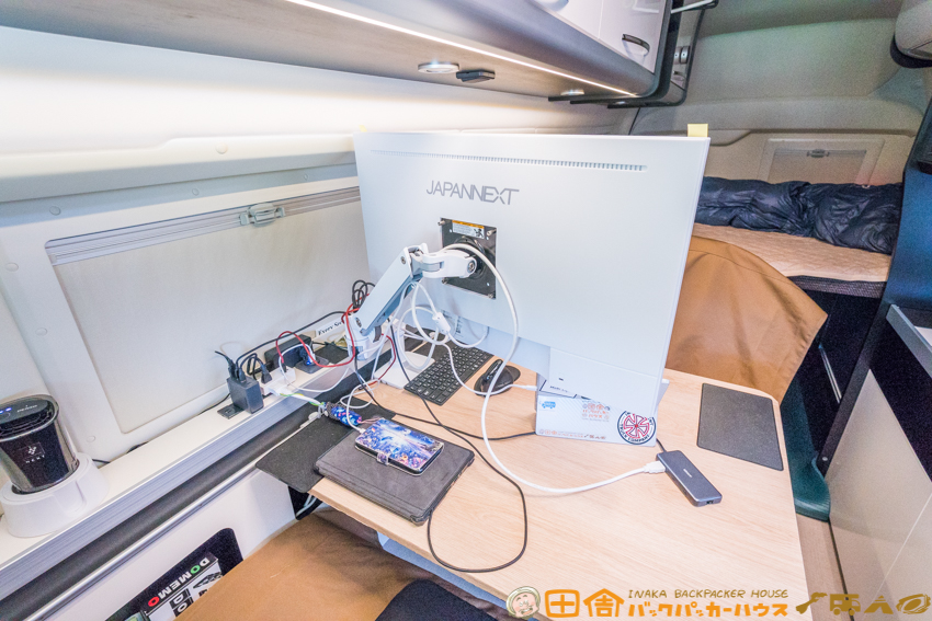 トイファクトリーのキャンピングカー「バーデン・アルタモーダ」のデスク/テーブルに、エルゴトロン製のモニターアームとジャパンネクストの27インチ4Kモニターを設置した。これにより、キャンピングカー内のワークスペースが格段に快適になった。