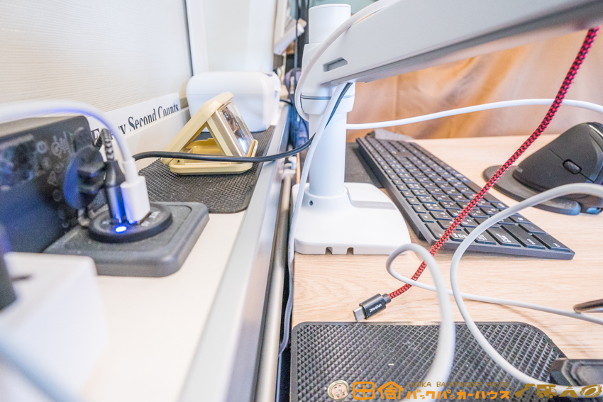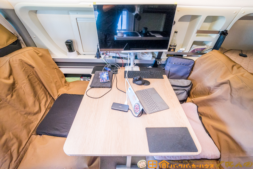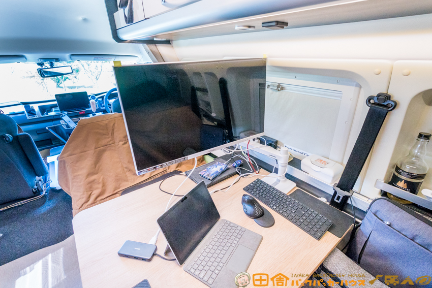 これまではUSB-C給電可能な15.6インチのポータブルモニターを使っていたが、27インチの大画面モニターへの変更により、作業効率と快適性が大幅にアップ。まさに“車中ワーク”の理想形に近づいた。
