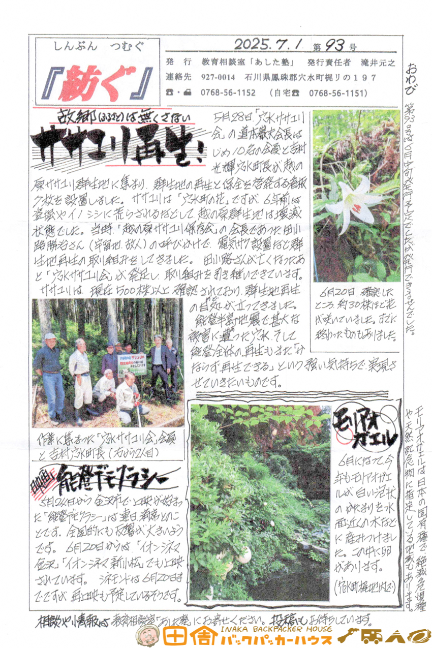そんな滝井さんが毎月発行している手書き新聞「紡ぐ(つむぐ)」の最新号、第93号(2025年7月1日発行)をいただいたので紹介したい。
