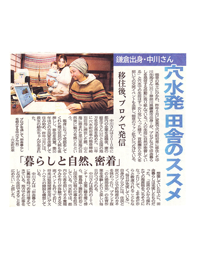 ▽穴水発、田舎のススメ 「暮らしと自然、密着」 移住後、ブログで発信 神奈川県鎌倉市出身の中川さん 能登・穴水町岩車へ移住して約1年。ホームページ、ブログ、ソーシャルメディアを介して、自身の田舎暮らしの様子を発信。その取り組みを、北國新聞が紹介してくれた。 |