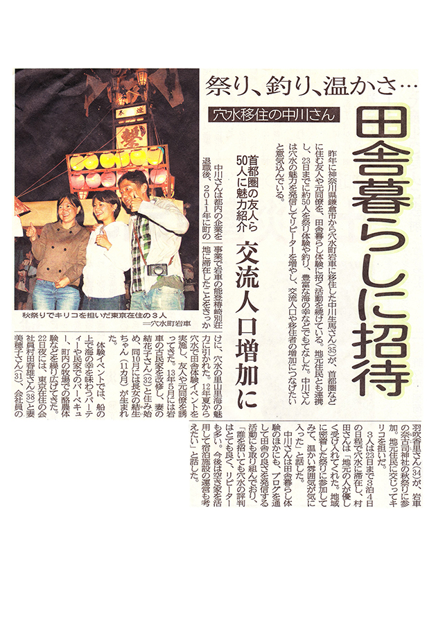 ▽移住男性『穴水おいで』首都圏の友人ら50人招待 能登・穴水町岩車のキリコ祭りの時期をきっかけに、「“ざっくばらんな”田舎ライフスタイル体験」を実施。東京や神奈川からの友人が岩車へやってきて、洋上パーティー、奥能登一周、キリコ祭りを体感するなどして、能登を満喫した。その取り組み北國新聞に掲載された。 |