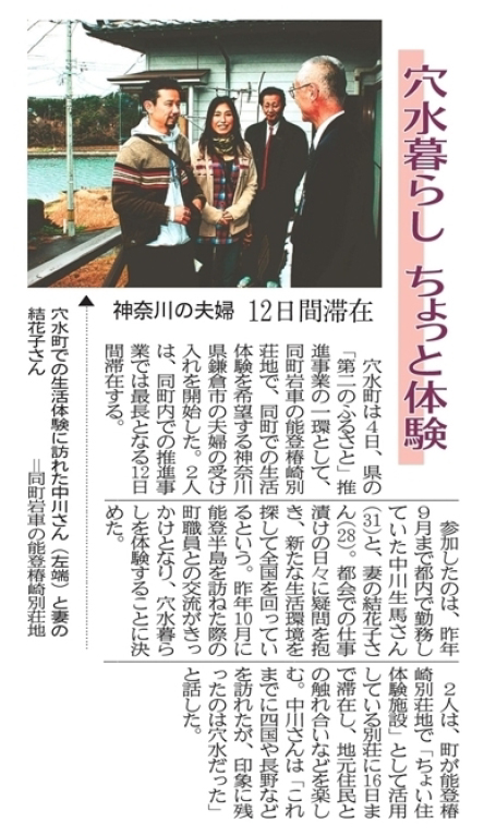 ▽穴水暮らし ちょっと体験 田舎/地方を中心に旅をし...その途中、能登・穴水町(石川県)で田舎体験暮らしがあることを知り、田舎暮らしを「ちょっと体験」した。 「ちょい住み体験」としてはぼくら田舎バックパッカー夫婦が最初の体験者。旅の途中 穴水町で出会った当時 穴水町役場の企画振興課の課長 新田信明さん(現・町の議員)が企画したもの。 |